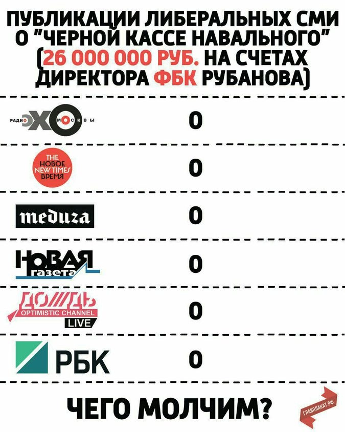 В четверг, 20 апреля, на Новом Арбате появился плакат, на котором отражена реакция ряда ведущих либеральных СМИ на громкое расследование о «черной кассе» Алексея Навального.