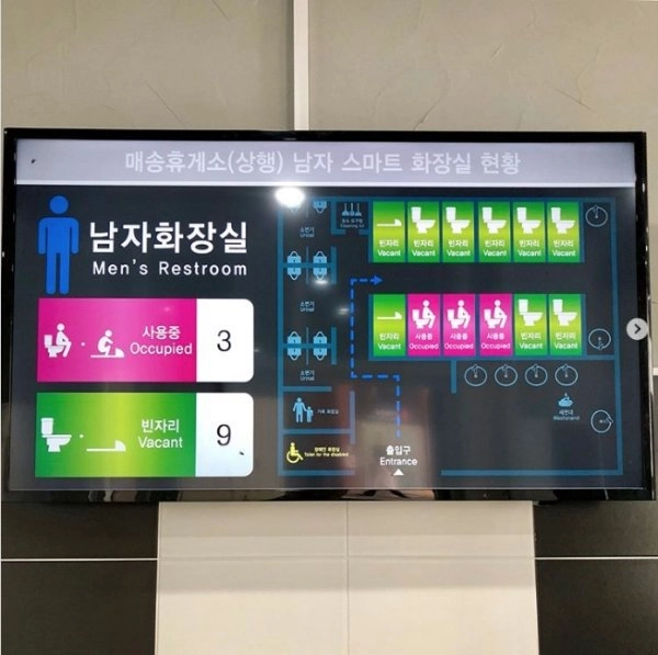На входе в уборную висят таблички, показывающие, какие кабинки свободны.