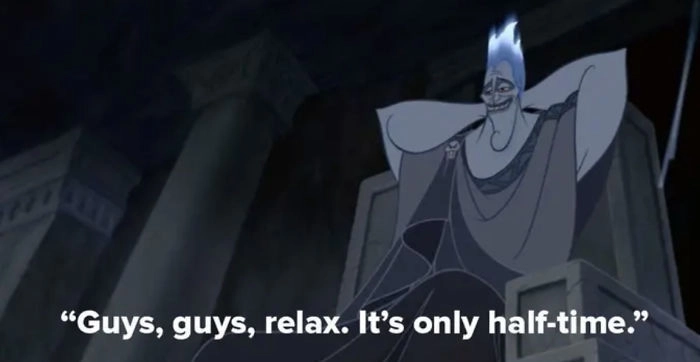 В мультике «Геркулес» Аид говорит: «Ребята, расслабьтесь, это был первый раунд», точно на 46-й минуте 92-минутного фильма