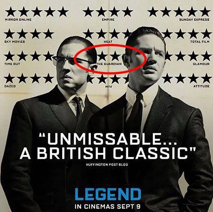 Постер к фильму «Легенда» высмеивает негативный отзыв на две звезды от издания The Guardian, скрывая его за головами главных героев