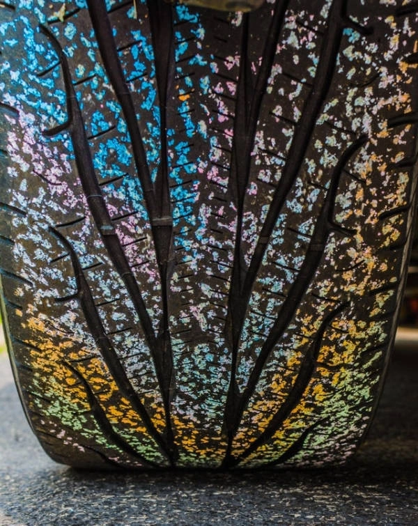 Шина после того, как автомобиль проехал по детскому рисунку на асфальте