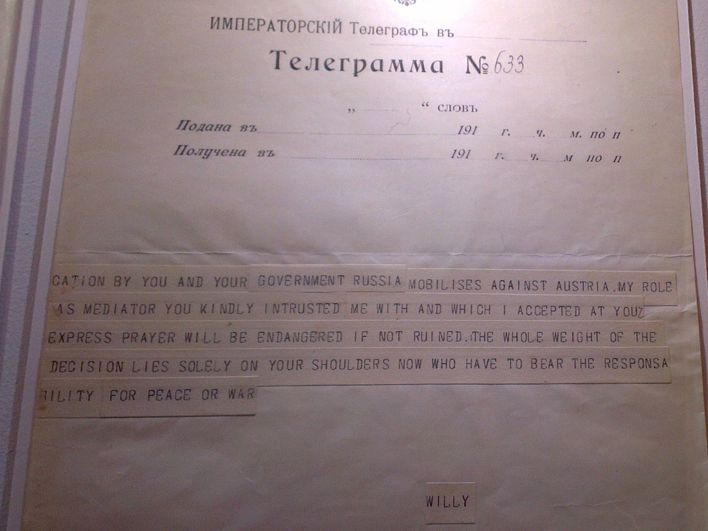 Мировая бойня закончилась для Российской Империи чадом революции и ещё более противоестественной Гражданской войной. Есть на выставке в Манеже раздел, посвящённый и этим страницам истории. Перед зрителем предстают прелюбопытные документы. Например, формальное, но при этом пугающее по содержанию оповещение председателя Госдумы Родзянко Императору о положении дел в предреволюционной стране.