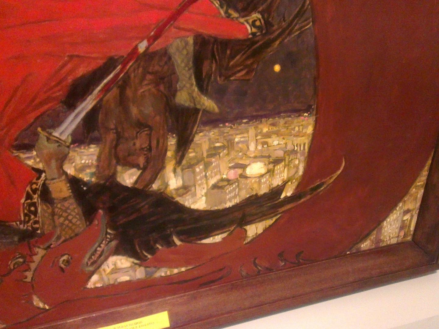 А присмотритесь к нижней части изображения страшного суда, производимого Георгием Победоносцем над тёмными силами? Не кажется ли вам удивительным, что мы видим там пейзаж современного мегаполиса?