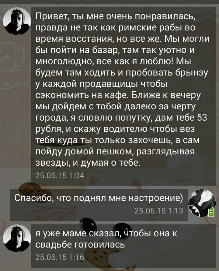 Обольщение — сложная наука, секреты которой постичь удаётся не каждому. Как флиртовать так, чтобы с вами сразу захотели пойти не то, что в кино, но и под венец? Ответ на этот вопрос знают настоящие мастера флирта! Мы собрали для вас подборку сообщений от людей, которые знают толк в кокетстве. Внимание! Если вы захотите использовать какие-то фразы в реальной жизни, редакция «Ридуса» не несёт ответственности за последствия. Но мы искренне желаем вам удачи!