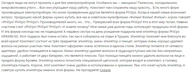 Заказные отзывы написаны литературным языком, выглядят очень красиво и хорошо читаются. Вряд ли настоящий покупатель будет тратить время на то, чтобы оставить в комментарии об услуге целый опус.
