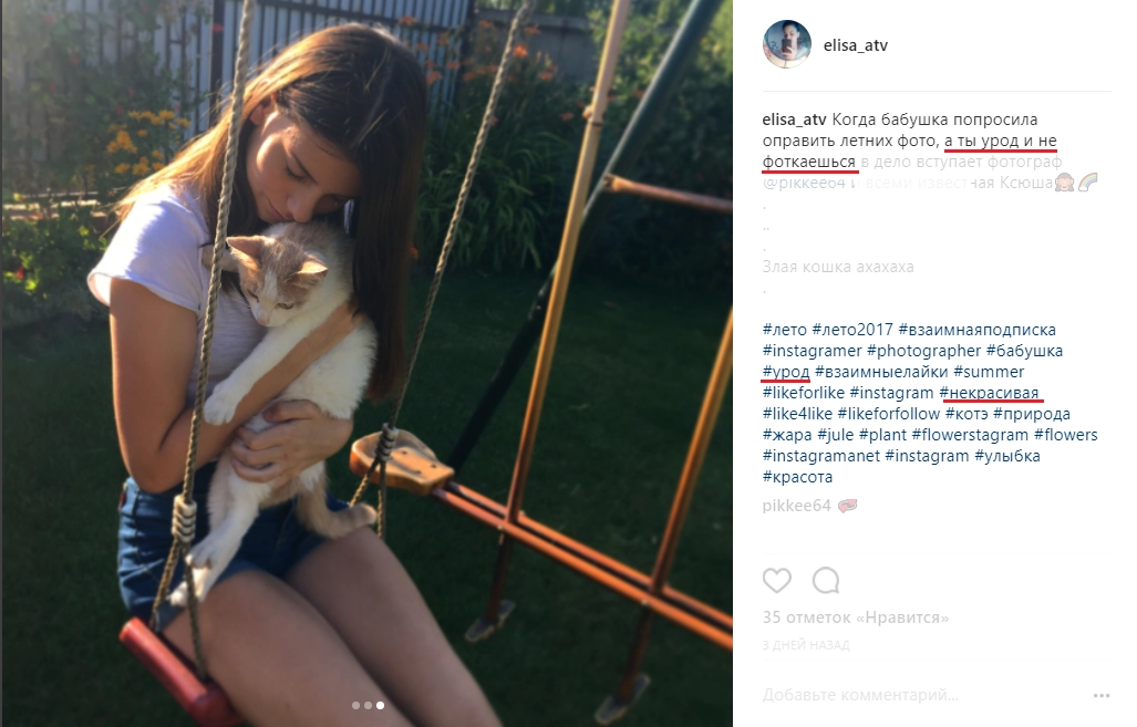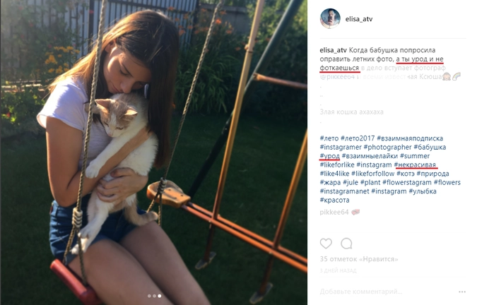 Еще хуже, когда симпатичные девушки выкладывают свои фото в Instagram c хештегами „толстуха“, „уродина“, „жир“… Дорогая, ты думаешь, мужчинам приятно отговаривать тебя от подобной ерунды? Это бред полнейший, проблемы с головой, лучше не связываться.