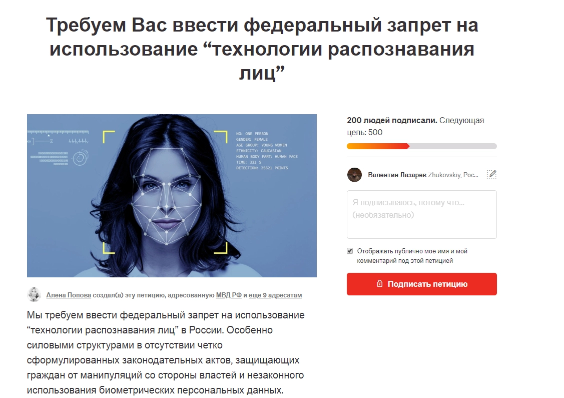 Многие пользователи Рунета выступили в поддержку инициативы Поповой — не столько из высоких юридических соображений, сколько из опасения стать жертвой ошибки в распознающей лица программе. Петицию против системы распознавания, созданную на днях на сайте change.org, уже подписали около 200 человек.