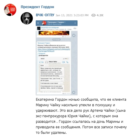 Гордон рассказала, что накануне вечером новый адвокат Марины попросила ту приехать в одну из московских клиник на психологическую экспертизу, результаты которой якобы могли бы помочь в суде. Чайка согласилась. Когда она приехала к назначенному месту, к ней подошли «люди в масках, которые представились сотрудниками ФСБ или ФСО».