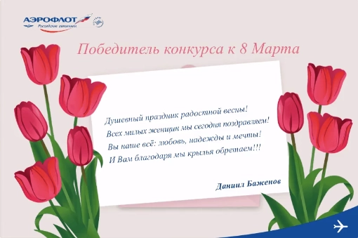 Отметим, что лирическое четверостишие, которое звучит сегодня в салонах авиалайнеров, было отобрано в ходе конкурса, проводившегося накануне Международного женского дня среди подписчиков официальной группы «Аэрофлота» в социальной сети «ВКонтакте». Победителю, коим оказался некто Даниил Баженов, будет вручен сертификат на два лица на перелет туда-обратно классом Эконом в любой город маршрутной сети «Аэрофлота».