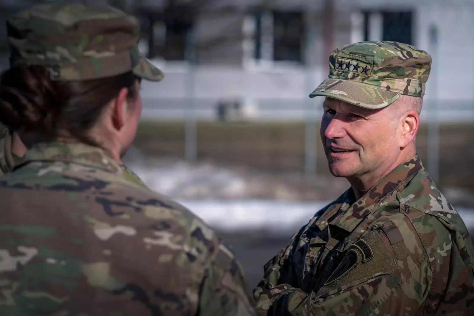 Генерал армии Кристофер Каволи, командующий США Армия Европы и Африки, разговаривает с 1-м лейтенантом. Келси Краусс, первый командир взвода ПВО Страйкера в Адажи, Латвия, 5 марта 2022 года.