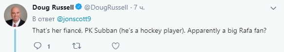 Попытки Суббана осадить невесту из-за ее «слишком бурной реакции» попали на видео. Комментаторы предположили, что хоккеист — фанат Надаля и поэтому не выдержал бурных аплодисментов его сопернику.