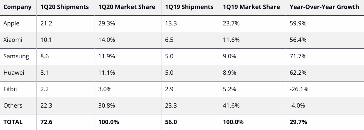 Всего в первом квартале было продано 72,6 миллионов устройств носимой электроники. Apple продала 21,2 миллиона девайсов, 4,5 из которых только Apple Watch. Такой результат позволил Apple стать лидером и занят 29,3% рынка носимой электроники. Но не только умные часы Apple Watch являются для Apple главным продуктом на этом рынке, у компании также есть две версии беспроводных наушников Apple AirPods.