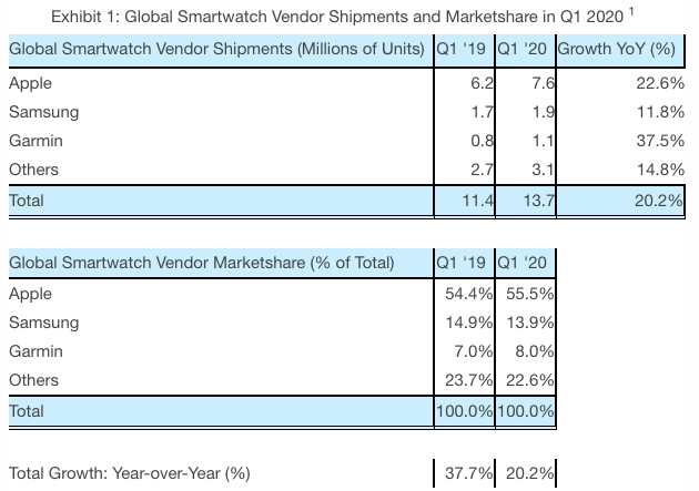 В первом квартале 2020 года Apple продала 7,6 миллионов умных часов Apple Watch и заняла 55,5% рынка, продажи компании увеличились на 22,6%. Вторую позицию рейтинга занимает Samsung с долей в 13,9%, южнокорейская компания продала 1,9 миллионов своих умных часов. Замыкает тройку лидеров Garmin с долей 8% и продажами на уровне 1,1 миллиона девайсов.