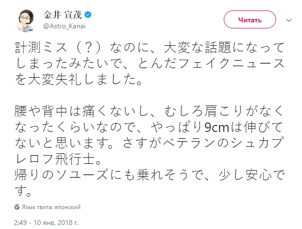 Японский астронавт Норисигэ Канаи, сообщивший накануне о том, что за три недели нахождения на борту МКС он вырос на девять сантиметров, принес извинения за «фейковую новость».