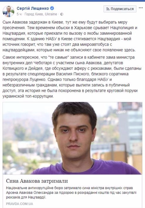 Чтобы защитить своего сына Александра Авакова, задержанного 31 октября Национальным антикоррупционным бюро страны (НАБУ), министр внутренних дел Украины Арсен Аваков мобилизовал полицию и Национальную гвардию. Об этом сообщил на своей странице в Facebook депутат Верховной рады Сергей Лещенко.
