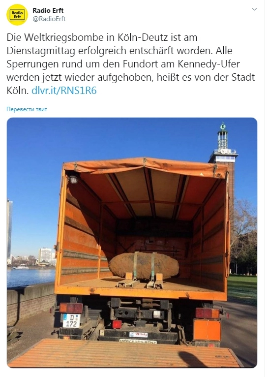 Бомбу в Кельне нашли на набережной также во время строительных работ. Она оказалась американской, и была успешно обезврежена в короткий срок.