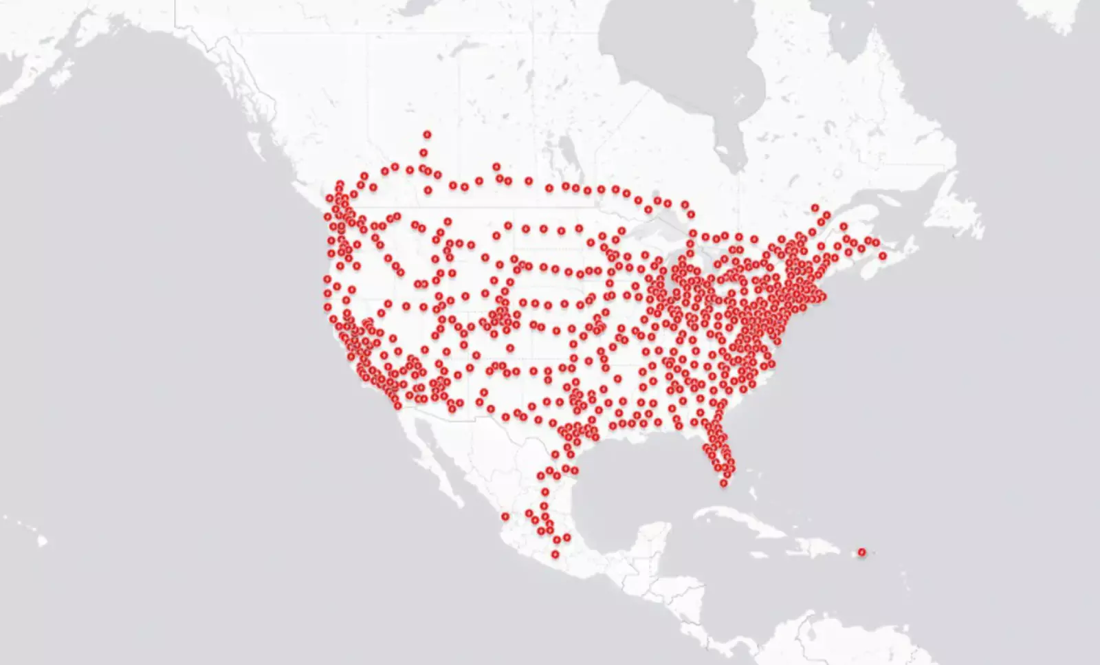 Карта расположения станций подзарядки Tesla Supercharger в США