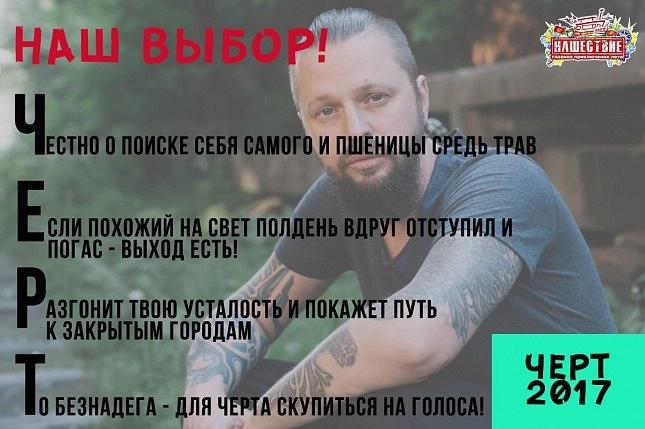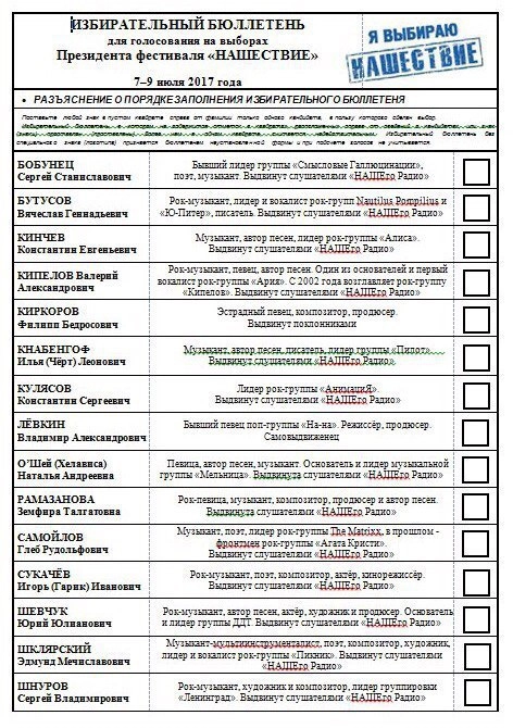 Как ранее писал «Ридус», впервые в рамках «Нашествия» проходят выборы президента рок-фестиваля: в избирательном бюллетене — 15 фамилий культовых отечественных музыкантов.
