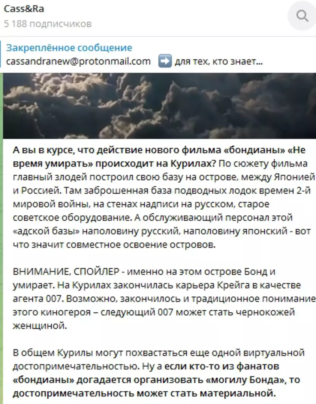 После выхода 25-го фильма о Джеймсе Бонде «Не время умирать», в финале которого агент 007 предположительно погибает на безымянном острове «между Японией и Россией», в ряде Telegram-каналов появились посты о том, что неплохо было бы создать на одном из реальных курильских островов памятник супершпиону. Одним из первых тему поднял Cass&Ra.