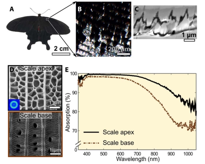 Трехмерное изображение показало, что главный секрет крыльев черной бабочки — это цилиндрическая структура, способная поглощать свет под любым углом. Система состоит из тонких вытянутых лопастей внутри крыла, которые направляют свет в нужную область.