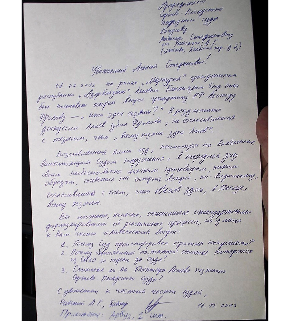 Официально арбузы явились приложениями к заявлениям, которые были поданы байкерами через канцелярию: «Приложение: Арбуз, 1 шт.», - так и написано в одном из заявлений байкеров на имя председателя Сергиево-Посадского городского суда Алексея Богунова.