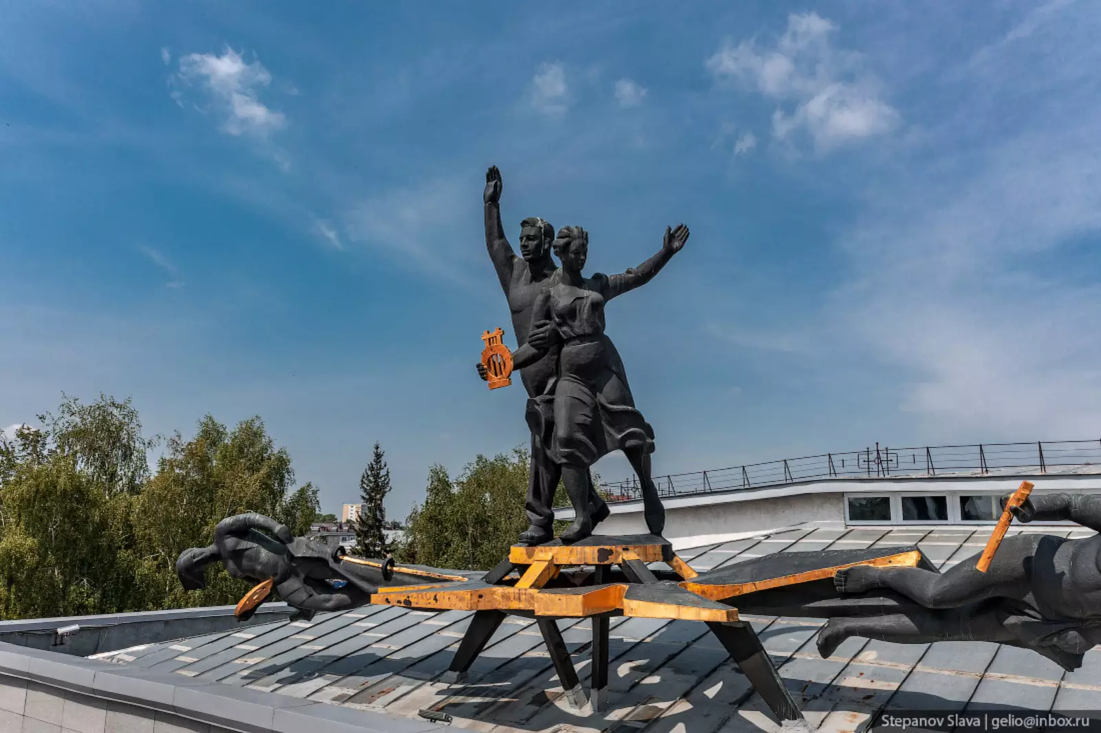 29. Скульптурная композиция «Искусство и народ». По замыслу художников, скульптуры призывают народ в мир искусства, о чем свидетельствует два главных персонажа: мужчина и женщина — рабочие, которые держат в руках лиру.