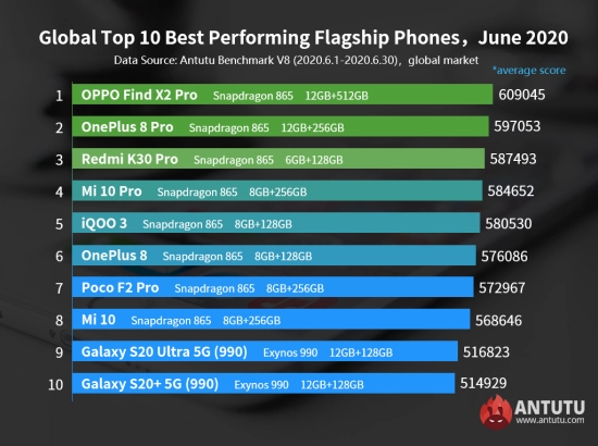 В китайском рейтинге присутствуют только смартфоны, работающие на процессоре Qualcomm Snapdragon 865. В его глобальной итерации уже присутствуют решения Samsung на процессорах Exynos 990. Возглавил рейтинг в очередной раз Oppo Find X2 Pro в версии на 12 Гб оперативной памяти и 512 Гб постоянной, который набрал 609 045 баллов в бенчмарке. Следом за ним идет OnePlus 8 Pro c 597 053 баллами. Замыкает тройку лидеров Redmi K30 Pro c 587 493 баллами.