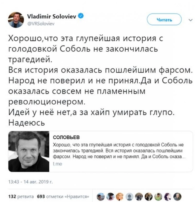 «Думаю, что у Соболь была очень условная голодовка, — сказал он. — Голодовку можно контролировать, когда человек находится под наблюдением. Человек, который действительно голодает, так не выглядит, не двигается, не разговаривает».