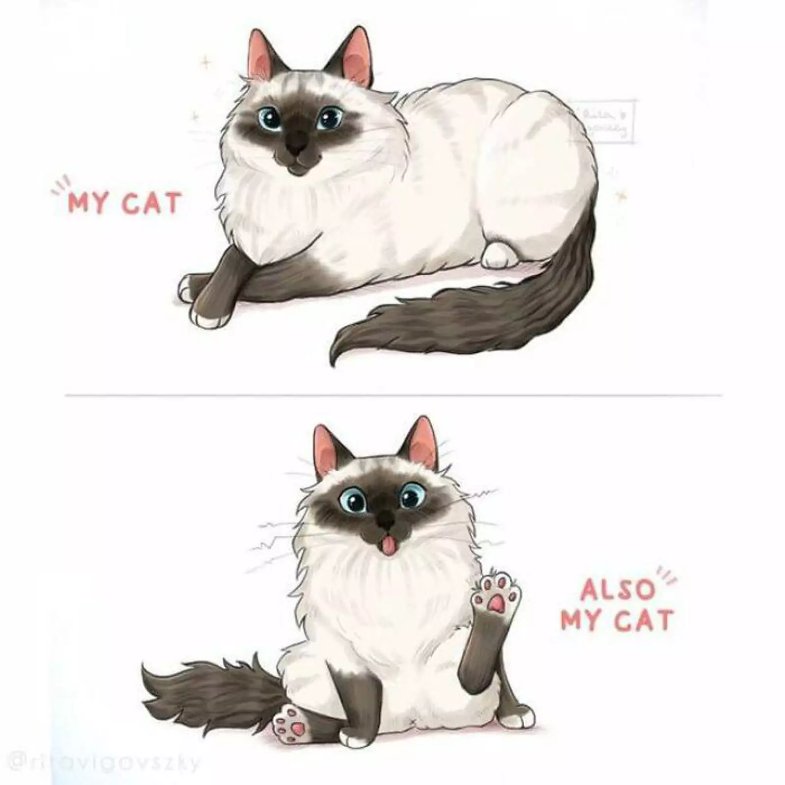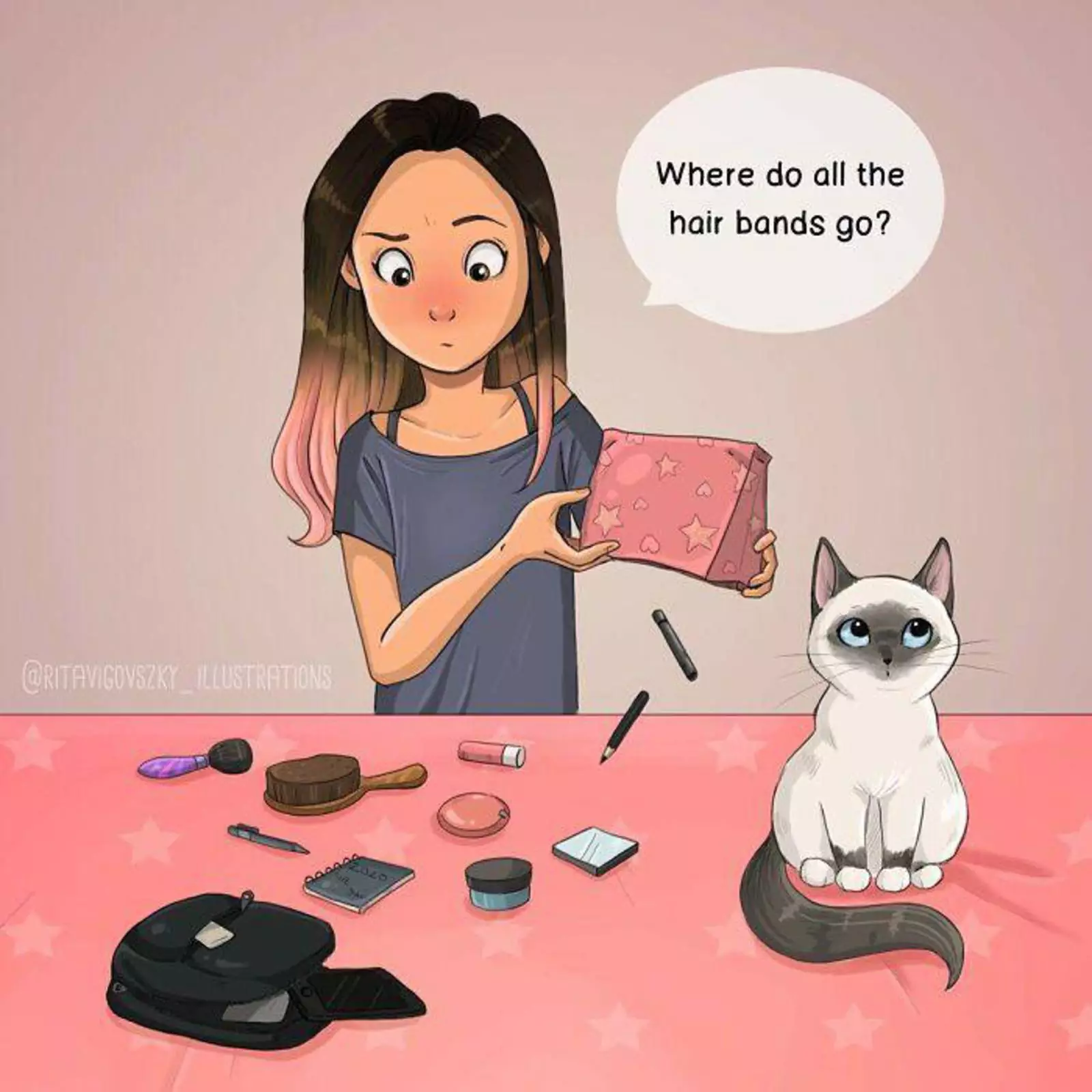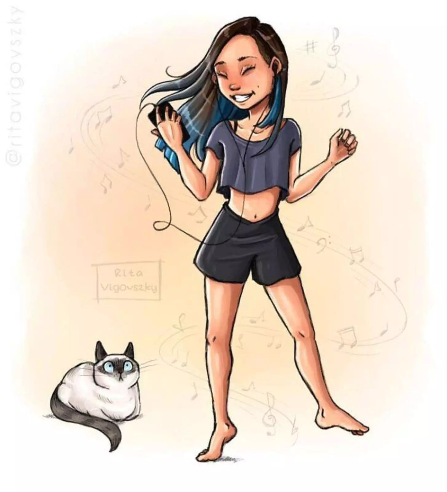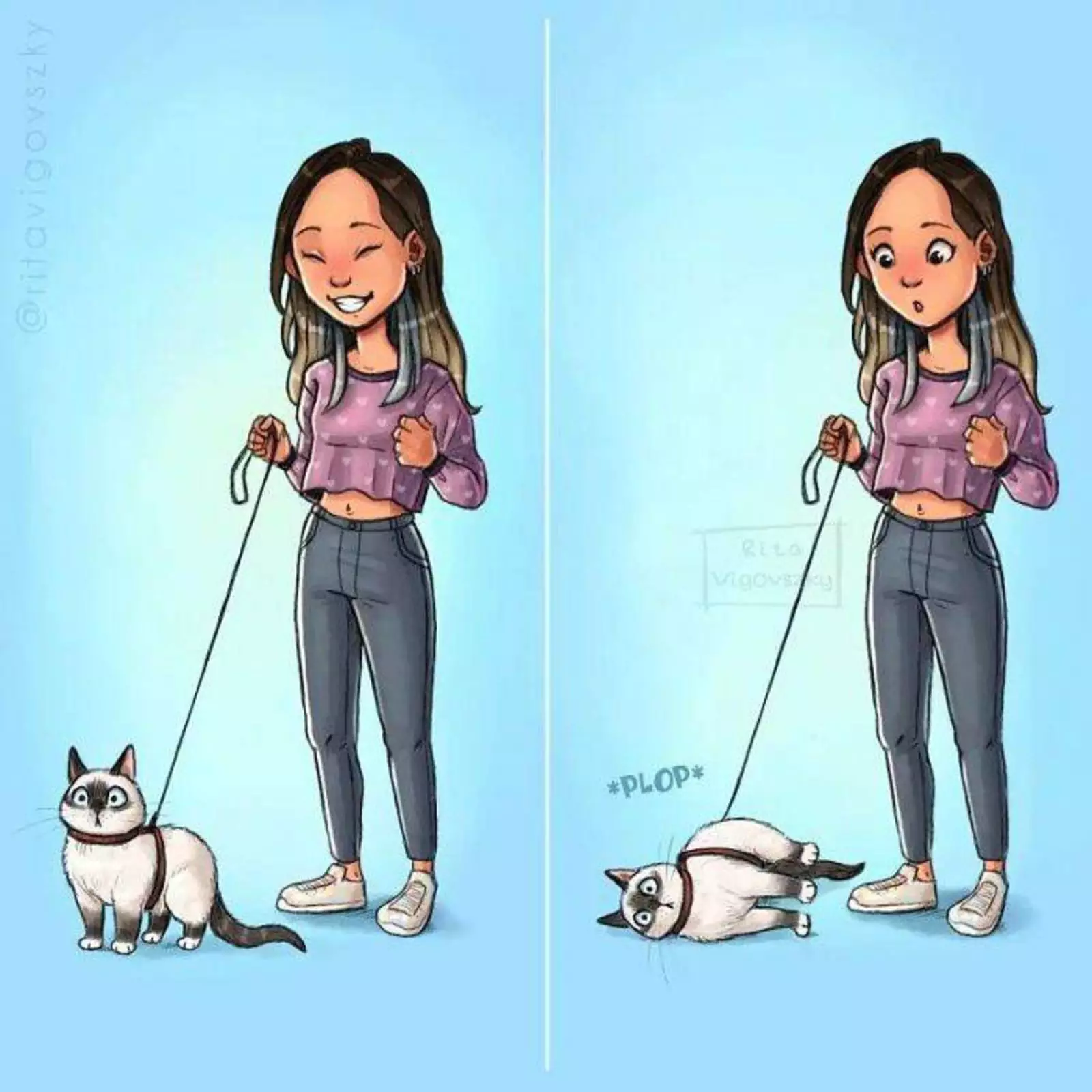 Если вы не представляете своей жизни без пушистых засранцев, которые 99% времени смотрят на вас свысока, устраивают тыгыдыги в шесть утра и оставляют свою шерсть по всей квартире, то точно узнаете себя в этих иллюстрациях. Художница Рита Виговски создала серию работ, которую посвятила хвостатым питомцам, совсем недавно, но уже успела найти преданных поклонников.