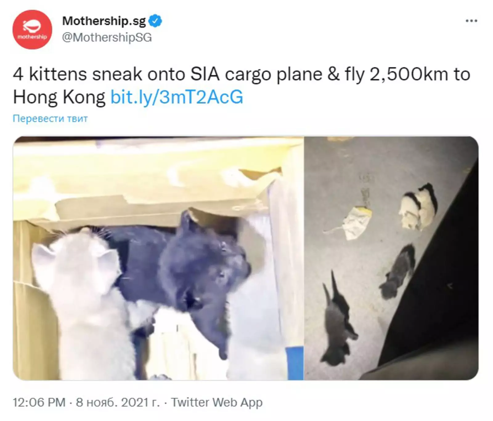В прошлую субботу сотрудник Singapore Airlines осматривал грузовой отсек самолета, который должен был лететь из Сингапура в Гонконг (Китай), и внезапно услышал писк и звуки какой-то возни. Мужчина пригляделся и обнаружил четырех милейших нарушителей: двух белых и двух черных котят.