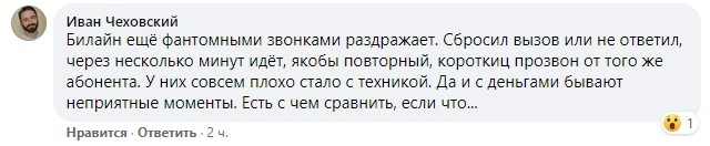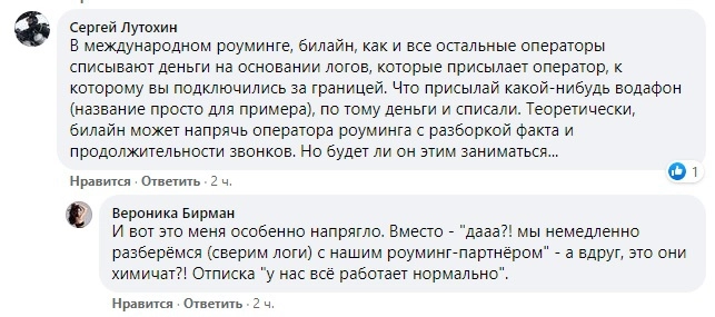 Мой вердикт? Разводка абонентов с надеждой, что «не заметят» — до эры мессенджеров у меня всегда были ощутимые счета в роуминге, этих +200−400 рублей и не заметила бы. И, возможно, с какой-то галочкой больше так с абонентом не делать, раз у них есть надежда, что больше таких списаний у меня не будет, — заявила Вероника Бирман.Многие пользователи Facebook в комментариях к жалобе абонента «Билайн» подтвердили ее слова о подозрительных списаниях за несуществующие звонки, сообщив, что сталкивались с таким и у других мобильных операторов.