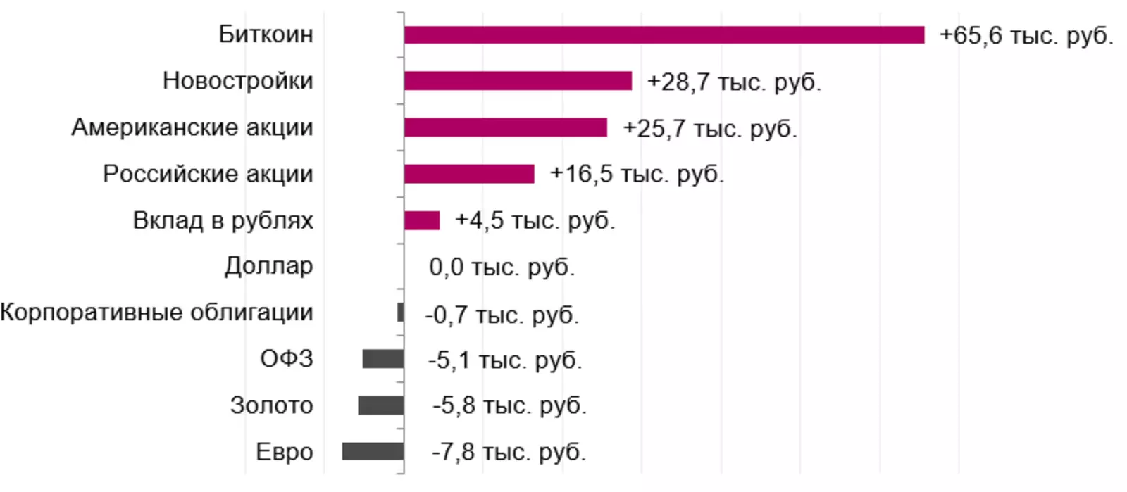 Согласно подсчетам аналитиков, на каждые 100 тысяч рублей, инвестированных в биткоин в начале 2021 года, в конце декабря можно было бы получить 65,6 тысячи рублей прибыли. Доходность от вложения в новостройки составила бы 28,7 тысячи рублей, американские акции — 25,7 тысячи, российские акции — 16,5 тысячи, а рублевый депозит принес бы 4,5 тысячи рублей.