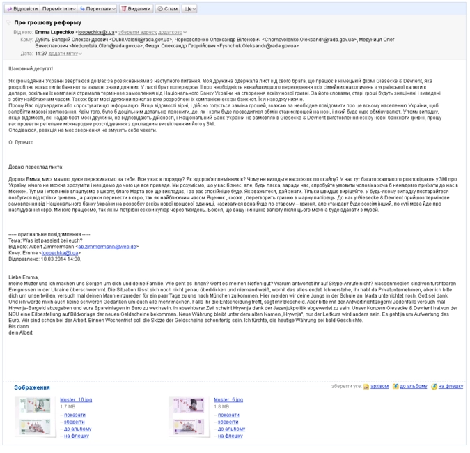 В своем письме Алберт утверждает, что в ближайшее время правительство Украины проведет денежную реформу, которая превратит нынешнюю гривну в «бесполезную бумажку». Компании Giesecke & Devrient, по его словам, поручено разработать дизайн новой банкноты. В связи с этим он рекомендует родственнице Эмме Лупечко избавляться от национальной валюты и переводить деньги в евро.