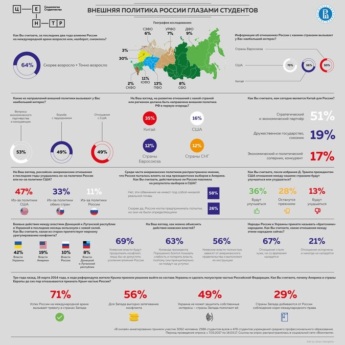 В исследовании принимали участие 3000 студентов из 72 регионов России. По данным опроса, 41% из этих учащихся внимательно следит за новостями из мира внешней политики, в то время как 52% респондентов не имеет привычки интересоваться политическими событиями специально, однако они остаются в курсе наиболее важных тем. Лишь 7% студентов политикой не интересуются в принципе.