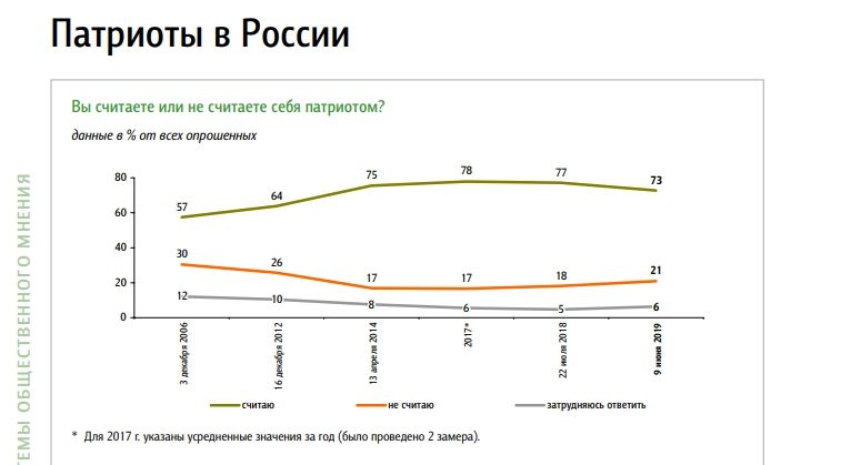 Патриотами себя называют 73% опрошенных. Это на 9% больше, чем в декабре 2012 года. Тогда в любви к Родине признавались 65% респондентов. А во время процесса воссоединения России и Крыма патриотами себя ощущали 75% опрошенных.