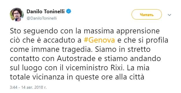 На месте ЧП работают бригады скорой помощи, спасатели и полиция. Министр инфраструктуры и транспорта Италии Данило Тонинелли назвал произошедшее огромной трагедией.