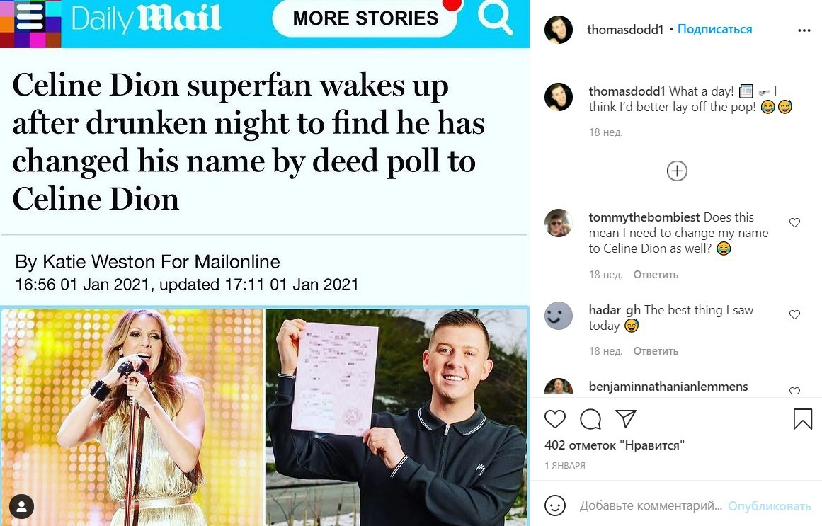 Во время изоляции я смотрел много живых концертов Селин Дион по телевизору. Наверное поэтому после нескольких алкогольных напитков, у меня возникла эта «отличная» идея со сменой имени. Труднее всего было сообщить отделу кадров на работе, что мне нужно изменить нижний колонтитул в шаблоне для рабочих писем. Теперь я думаю, что мое новое имя может быть отличным способом попасть за кулисы. Но еще иногда я молюсь, чтобы меня не остановила полиция — это будет неловко, — говорит Томас.