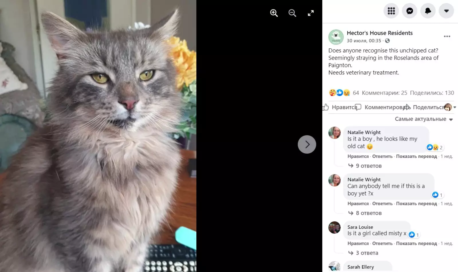 Волонтеры забрали Оззи из парка и привезли в ветеринарную клинику: после осмотра и небольшого лечения пушистого сфотографировали и разместили его снимок в группе Hector’s House Cat Rescue в соцсетях. Фотография кота случайно попалась на глаза Натали, когда она пролистывала ленту в Facebook, пишет Daily Mail.