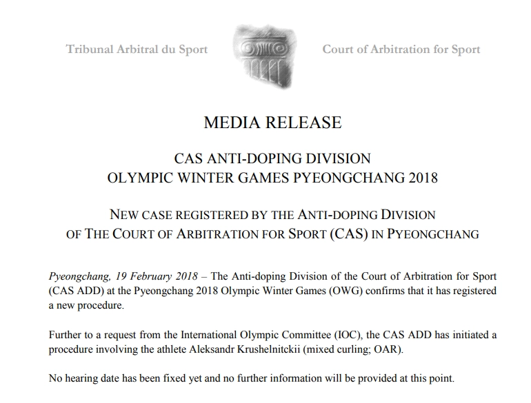 Спортивный арбитражный суд открыл дело в отношении российского керлингиста Александра Крушельницкого. Спортсмена подозревают в нарушении антидопинговых правил.
