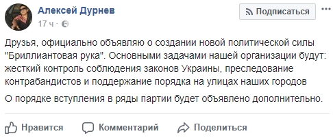 Список украинских политических сил пополнила партия «Бриллиантовая рука». О ее создании рассказал телеведущий Алексей Дурнев.