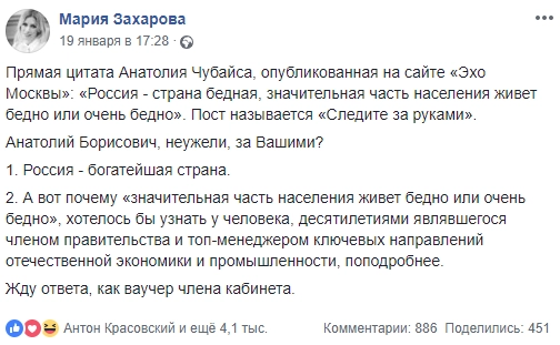 Глава правления «Роснано» Анатолий Чубайс ответил на критику официального представителя МИД РФ Марии Захаровой. Ранее она призвала его объяснить слова об истинной бедности россиян.