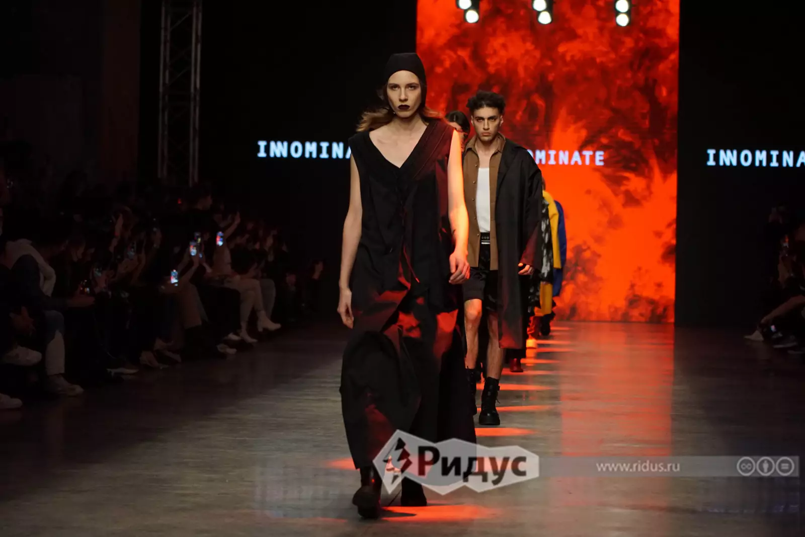 INNOMINATE — российский бренд одежды, созданный братьями Романом и Александром Ким, придерживается лаконичного дизайна и уделяет особое внимание геометрии. Коллекция Knight & Day («Рыцарь и день» — игра слов, созвучно с Night & Day). Идея — баланс между мужественностью и женственностью. Коллекция включает оверсайз-костюмы, плиссированные платья-накидки, объемные шорты.