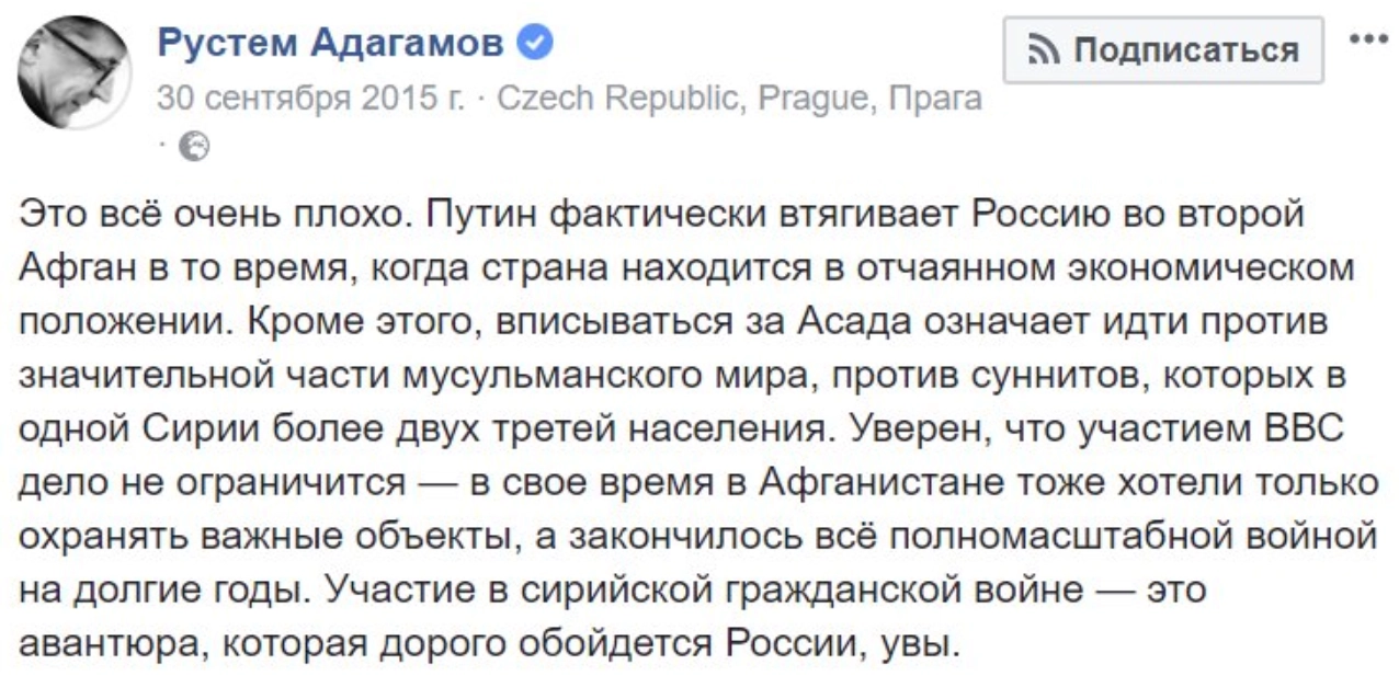 В 2015 году некоторые публицисты высказывали мнение, что сирийская спецоперация обернется для России «вторым Афганистаном». Особенно активно эту мысль популяризировал блогер Рустем Адагамов: