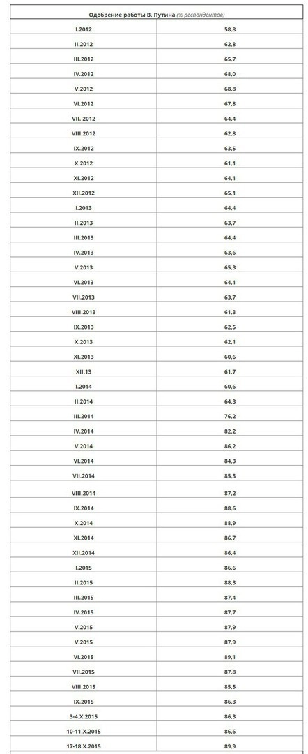 Россияне рассматривают нынешнюю ситуацию как внешнюю атаку на Россию со стороны США и их союзников. И в этой ситуации поддерживают умную и твердую политику Путина по защите страны. Этот рейтинг еще и демонстрирует провал политики Запада с помощью санкций помочь своим союзникам свергнуть Путина на волне народного недовольства. Ну и ракеты по ИГ с кораблей Каспийской флотилии всем тоже понравились. Россияне хотят жить в великой державе, это тоже ни для кого не секрет,отметил эксперт.В свою очередь член экспертного совета фонда ИСЭПИ Алексей Зудин в интервью «Ридусу» отметил, что за три недели силовой операции в Сирии у общества появились весомые основания, чтобы скорректировать свои оценки вверх. Политолог обозначил главные факторы обновления исторического максимума рейтинга главы государства: