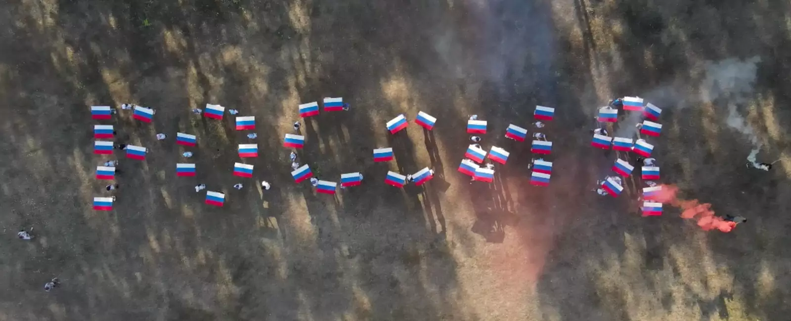 Активисты ОНФ Оренбургской области выстроились в слово «Россия» из 110 флагов на территории регионального молодежного центра «Авангард»: