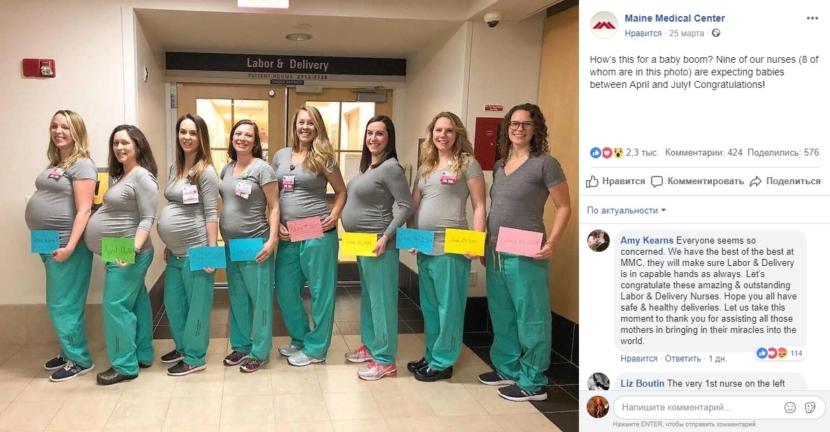 В родильном отделении больницы города Портленд, США, забеременели сразу 9 медсестёр. Фотография счастливых будущих мам была опубликована на страничке в Facebook. На снимке, на котором в кадр попало только восемь из девяти молодых женщин, каждая из них держит в руках лист бумаги с предполагаемым сроком родов. Дети медсестёр будут рождаться на свет с апреля по июль 2019 года.