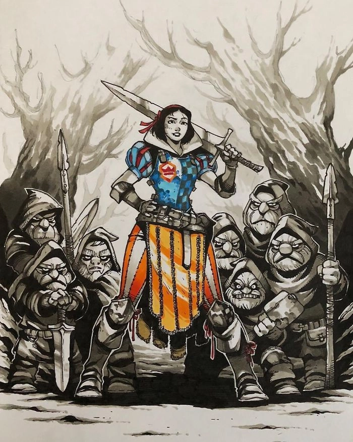 «Сначала мне захотелось нарисовать Белоснежку — для меня она самая бедняга из всех принцесс. Я сделал её вооружённой, опасной и способной защитить себя», — объяснил иллюстратор своё творчество. На хрупких красавиц, превращённых в эдаких фурий, можно посмотреть также в Instagram художника, за которым следит уже почти 65 тысяч человек.