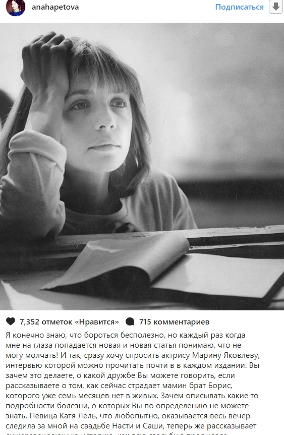 Хочу спросить актрису Марину Яковлеву, интервью которой можно прочитать почти в каждом издании. Вы зачем это делаете, о какой дружбе Вы можете говорить, если рассказываете о том, как сейчас страдает мамин брат Борис, которого уже семь месяцев нет в живых, вопрошает Нахапетова.Досталось и за «очень богатую фантазию и воображение» певице Кате Лель, которая рассказала свою «душераздирающую историю».