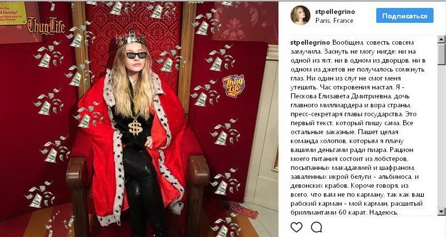 «Час откровения настал. Я — Пескова Елизавета Дмитриевна, дочь главного миллиардера и вора страны, пресс-секретаря главы государства. Это первый текст, который пишу сама. Все остальные заказные. Пашет целая команда холопов, которым я плачу вашими деньгами ради пиара», — с первых строк ошарашивает читателей девушка.