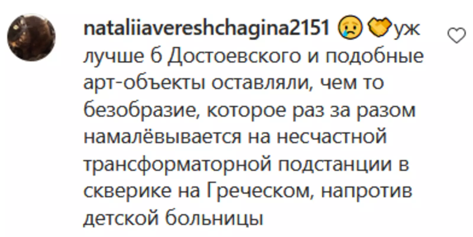 Он уверен, что писатель стал персоной нон грата в Петербурге и ему отказано в пребывании в городе. Также отмечается, что коммунальщиков не смущает слово из трех букв на стенах домов, в отличие от изображения Достоевского.